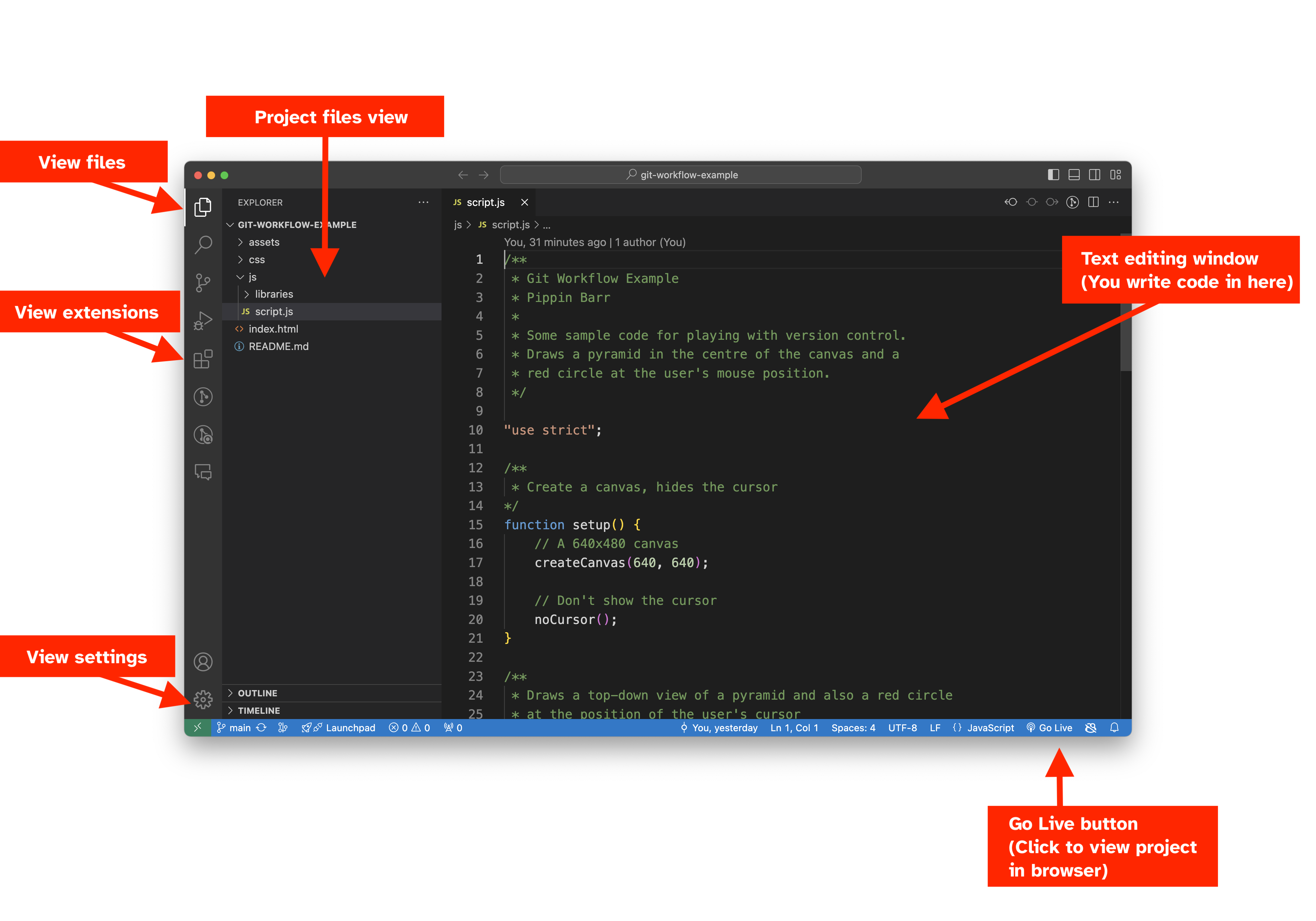 NOTE: You can also do all your version control inside VS Code if you’d like to. It’s more complex to set up and involves the terminal among other things, so ask your instructor or TA if you want help to do it.